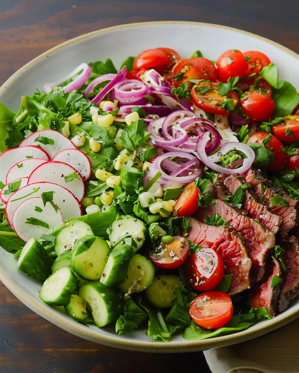 This salad turns cold roast beef into something fresh, flavorful, and satisfying. Thin slices of beef are paired with crisp greens, crunchy vegetables, and a bold, simple dressing that brings everything together. It’s light but filling, easy to throw together, and ideal for warm days or quick lunches.
