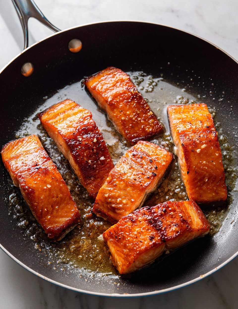 • Place salmon fillets skin-side down and cook for 4–5 minutes until crispy.