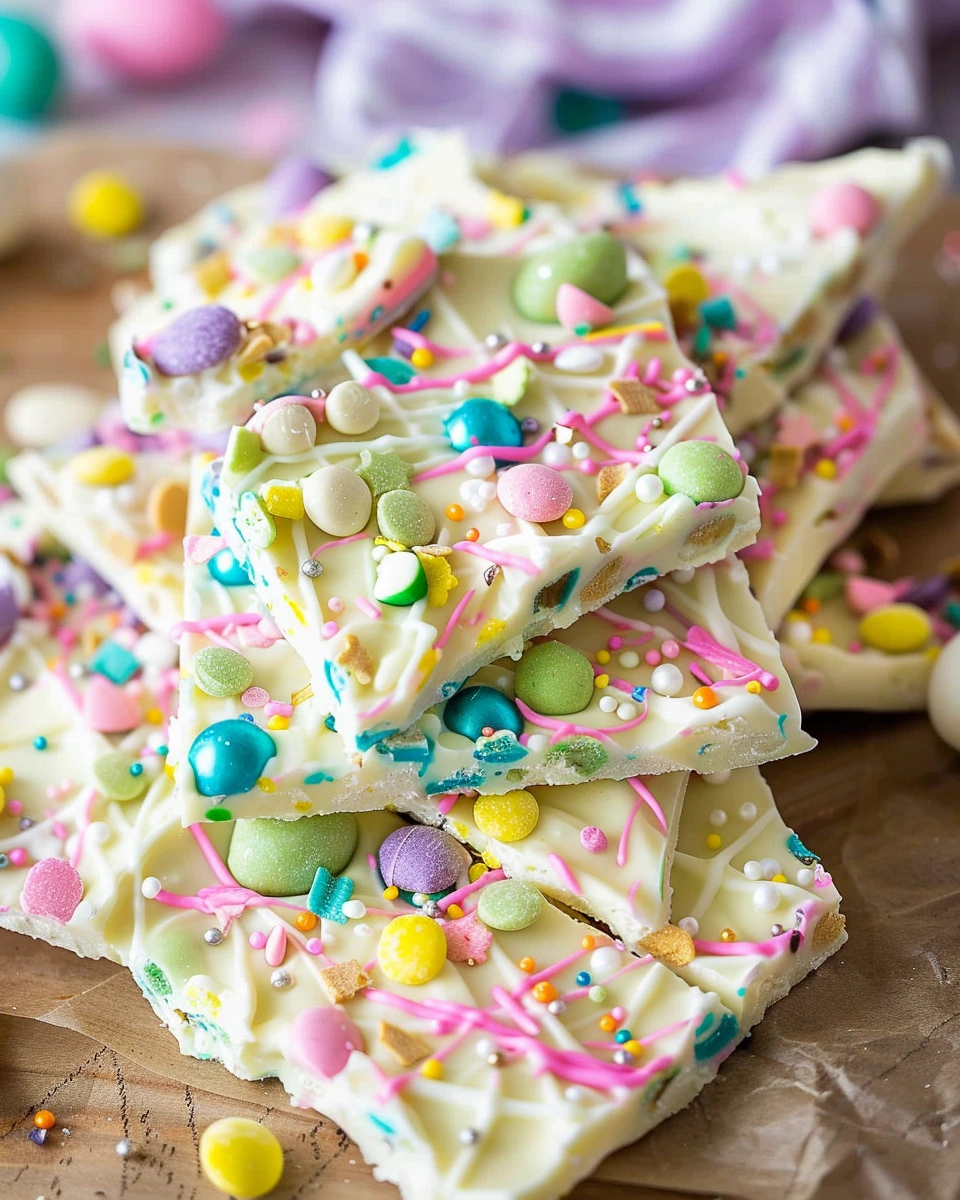 This white chocolate spring bark combines creamy melted white chocolate with cheerful toppings like pastel candies, dried fruit, and sprinkles. The result is a sweet, crunchy treat that’s perfect for spring holidays, parties, or homemade gifts.